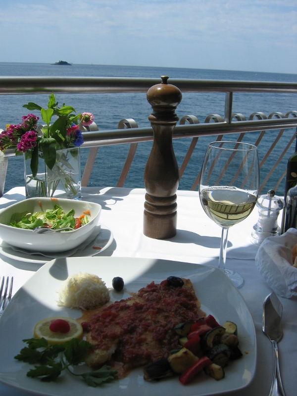 It was fantastic, this lunch.  I had a much needed green salad, delicious fresh fish with a sort of tomatoey sauce on it, and part of a bottle of Franc Arman Pinot Blanc – I bought a bottle, after asking my waiter if I could porta via the undrunk part out of there.  To which, of course, he gave me a hearty “Certo!” All of this I consumed on a pleasant balcony overlooking the sea: