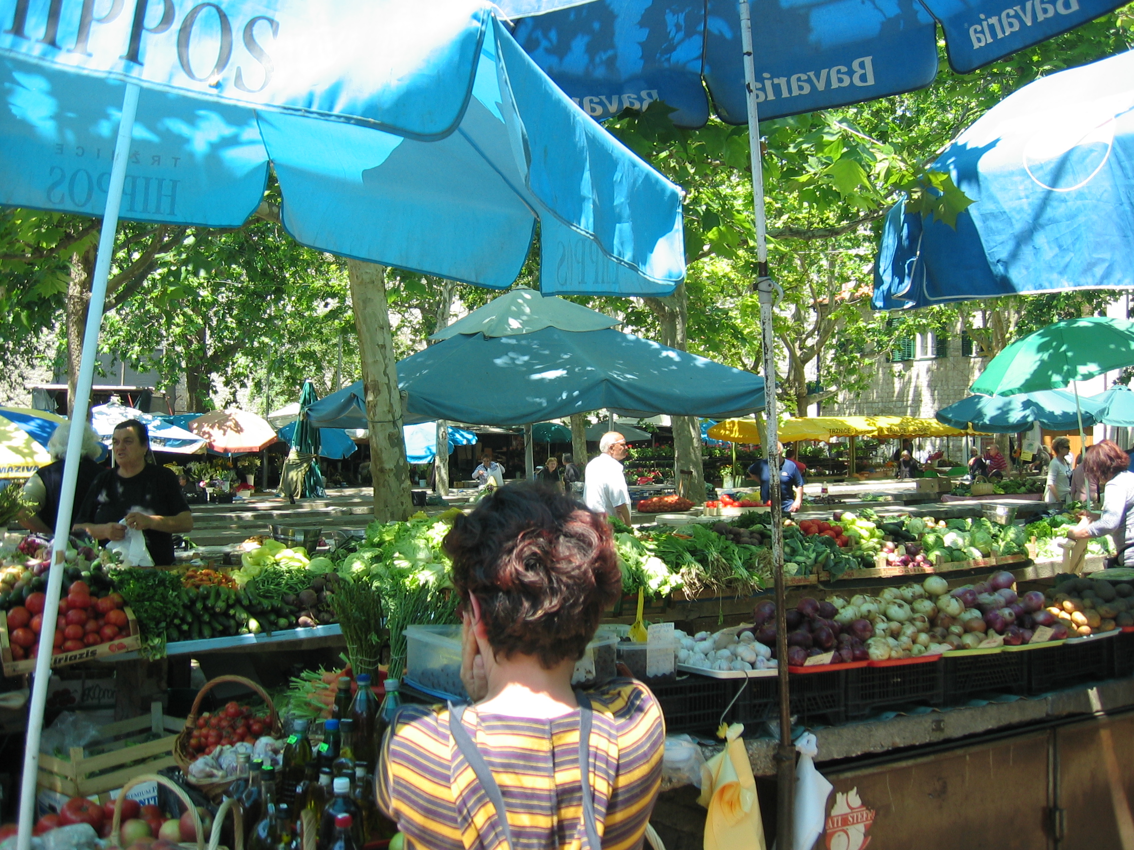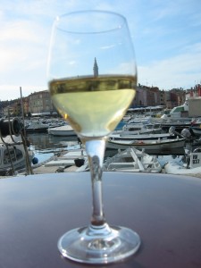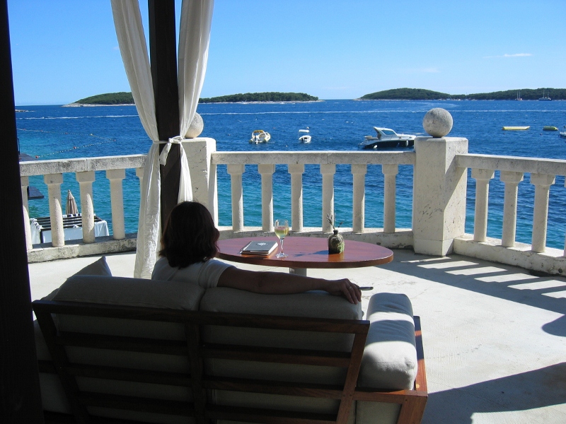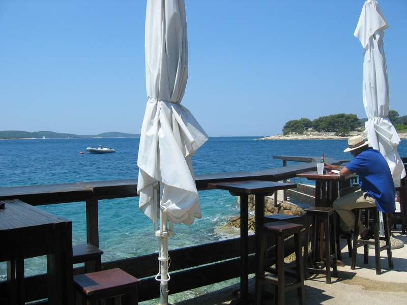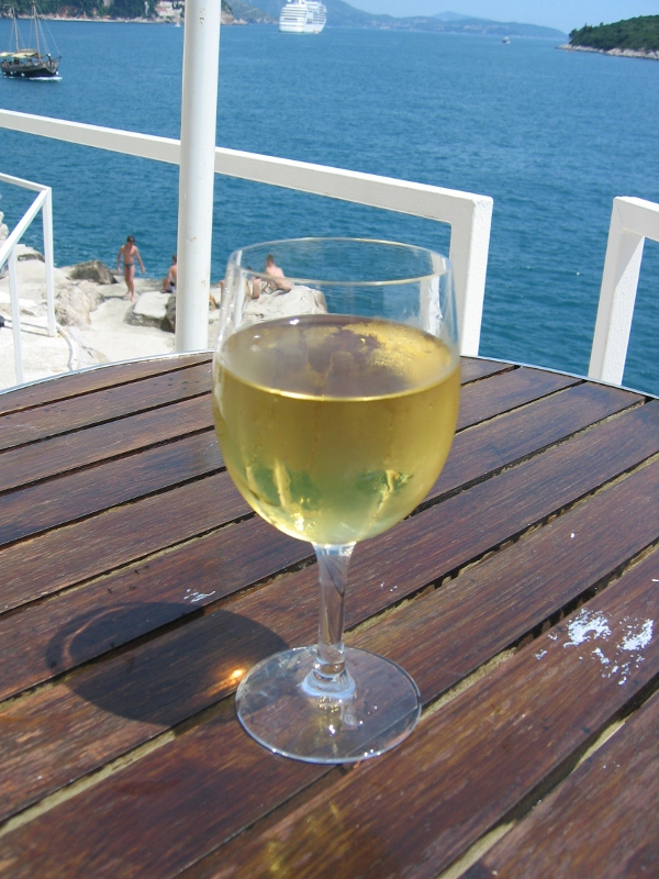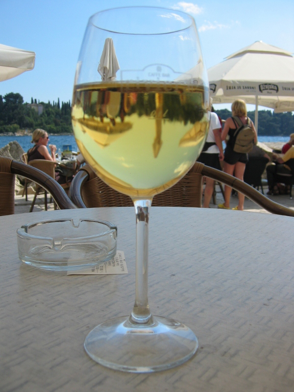 My first thought was: what the hell is that patty of mystery meat doing on my FISH PLATE and my second was: do I really have to stay on this boat for another five hours?  I mean, it just wasn’t really doing it for me. I started to pine for all my favorite haunts… my perch at the sea, my daily glass of Viognier at the Piassa Grande wine bar, the seven kuna glass of wine at the Buzz bar, and my favorite waitress the Riva bar, she of the Low Price and the Big Pour.  In the 4.5 minutes it took me to push some of the fish and the cabbage or whatever that stuff was around on my plate (and I admit, I even took a couple of bites -it would take a lot of wine to wash that taste out of my mouth. A LOT) I had made the decision.  I bailed.  Off the boat.  Sometimes you just have to suck up the loss of 220 kuna and carry on.