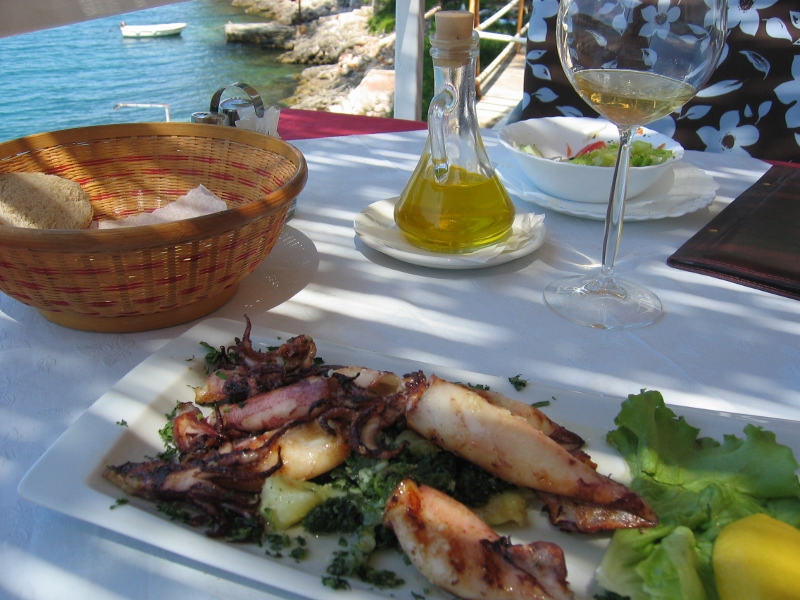 It was with great reluctance that I left Hvar Town.   My last day there, the on-off bus was still broken down (and they were not fibbing, I saw the bus in a mechanics yard later that day) so I took the public bus to the town of Jelsa.  Not a lot going on there – a very pretty little town, and I am sure there was a Hula Hula bar somewhere, but I didn’t see it.  I walked around, then had lunch – really good, grilled calamari on a bed of potatoes and swiss chard, which is a common side dish around here.