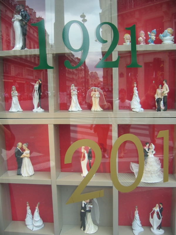 A store where you could buy wedding cake toppers, with two guys, two girls, mixed race, even just one woman, in case, I guess, she was celebrating… marrying herself? Dunno.  Whatever I said about the French not being perfect before – scratch that.