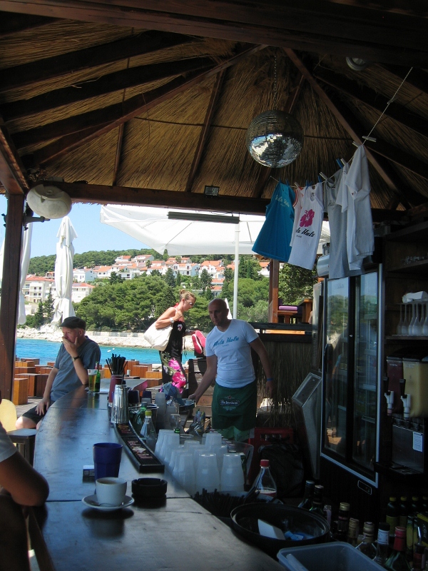 Prices can even vary wildly at the SAME bar.  One place I have been going to, right smack up against the corner of the harbor and the sea, has two servers – one who charges me 16 kuna for a huge pour, and another one that charges 23 kuna (the menu price) for a regular one.  I have a picture of my preferred server’s huge pour in my camera – will post that later.  Love her.