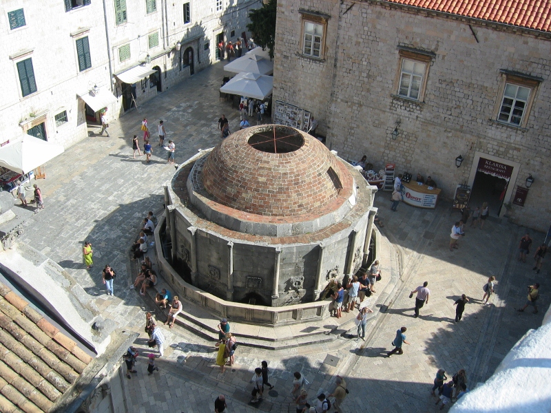 I did get out and walk around a bit, mostly on Friday.  I learned a trick to get away from the tourists – simply climb up two flights of the giant steps they have everywhere here.  One flight won’t do it.  Has to be two.  Once you have done that, voila, no more tourists!  Well, only a few, maybe ten or something.  I walked around up there and ended up at the Buza Gate, one of three entrances into the walled city.  I was sort of just standing there plotting my next move when this restaurant guy asked me if I wanted to eat at his restaurant right there.  I said “hvala – no.”  (No thank you.) This is the rest of the conversation, which could be funny or freaky, depending on your mood.
