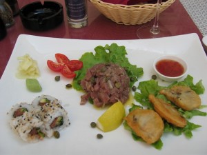 Let me backtrack a little, to put things into perspective.  Besides Monday night when I first got here, I ate every single meal in my apartment.  So on Saturday I decided to take myself out to a decadent lunch – something I like to do at home, too.  I went to a place called Puntalina.  My landlady had recommended it, and I had stopped in to their seaside bar one afternoon.  The guy who served me was painting a table blue, and another guy who worked there came down from time to time yelling out “Picasso! Picasso!” So I went back for lunch.